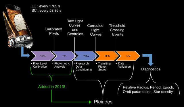 There are numerous other detecting challenges posed by the dynamics of exoplanets, stars and the great distances. But then there are also innumerable challenges associated with the workings of the 95 megapixel CCD array that is collecting light for Kepler. “Sensitivity dropouts” caused by those cosmic rays, horizontal “rolling bands” on the CCDs caused by temperature changes in the electronics, “optical ghosts” from binary stars that create false signals of transits on nearby stars — they are some of the many instrument artifacts that can be mistaken as a drop in light coming from a planet. Kepler’s data processing pipeline, much of which has been transferred over to the NASA Ames supercomputer, has the job of sorting all this out.