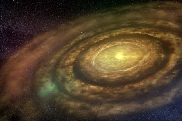 An artist rendering of a protoplanetary disk around a newly-formed star. Tiny grains of dust grow over millions of years into planetesimals and planets through collisions and the accretion of matter. (NASA)