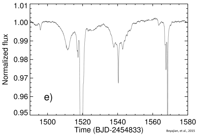 Theories on what was causing the very large dips ranged from a host of enormous comets, to a violently exploding planet, to an asteroid belt or the presence of close by stars, from an artifact of Kepler’s camera to, finally, an alien megastructure. (The last was offered by Penn State astronomer Jason Wright as a kind of “Hail Mary” explanation if and when the others are found wanting. But that’s what got the press.)