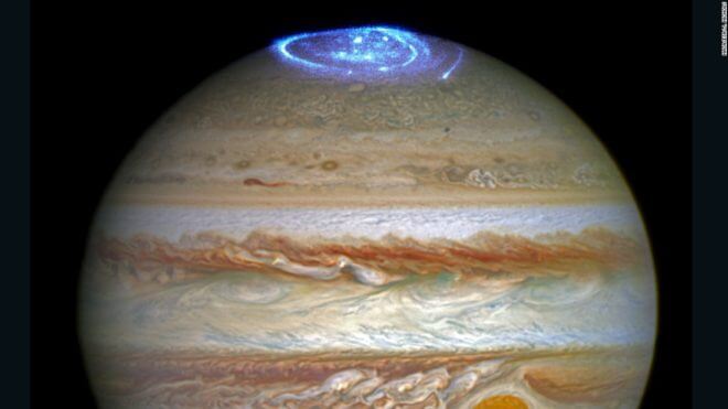 Jupiter’s enormous polar auroras — created by its intense magnetic fields — as captured by NASA’s Hubble Space Telescope.  While in transit, Juno collected data that supported and deepened knowledge of what was occurring when the images were collected. (NASA)