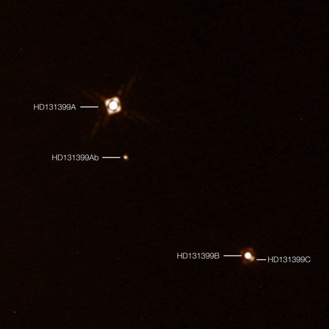 Two of the stars in the HD 131399 system are close together, twirling around each other like a spinning dumbbell. The third and far brightest star, which is located about 300 times further away than the distance between Earth and the sun, is orbited by the new gas giant planet HD 131399Ab. With a temperature of around 580 degrees Celsius and an estimated mass of four Jupiter masses, it is one of the coldest and least massive directly-imaged exoplanets.