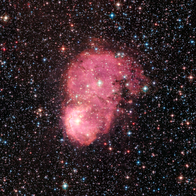 Together, the nebulas are called NGC 248 and are 60 light-years long and 20 light-years wide. It is among a number of glowing hydrogen nebulas in the dwarf satellite galaxy, which is found approximately 200,000 light-years away.