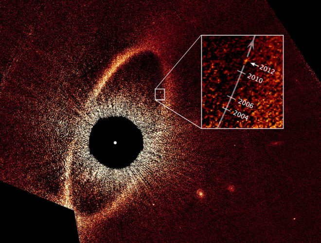 This false-color composite image traces the motion of the planet Fomalhaut b, a world captured by direct imaging. (NASA, ESA, and P. Kalas, University of California, Berkeley and SETI Institute)