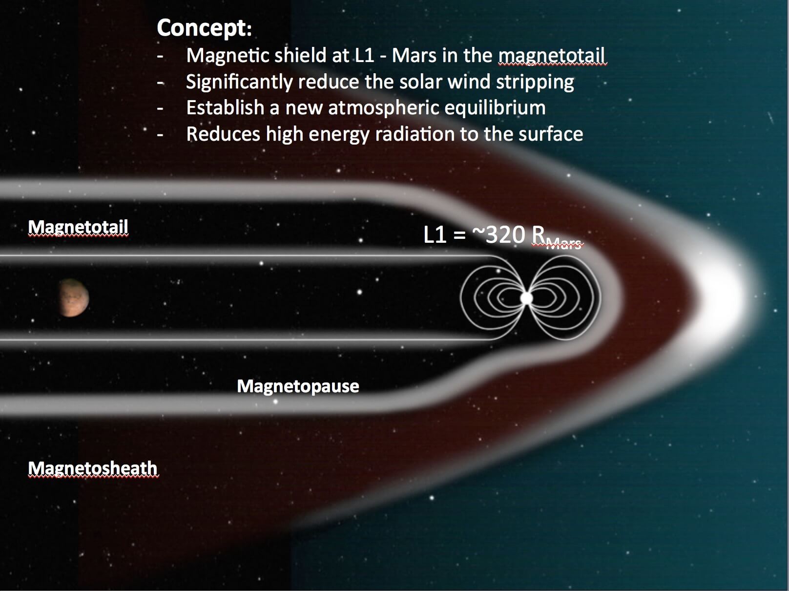 Simulations showed that a shield of this sort would leave Mars in the relatively protected magnetotail of the magnetic field created by the object. A potential result: an end to largescale stripping of the Martian atmosphere by the solar wind, and a significant change in climate.
