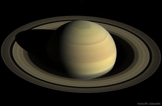 Saturn as imaged from above by Cassini last year. Over the next five months, the spacecraft will orbit closer and closer to the planet and will finally plunge into its atmosphere. (NASA)