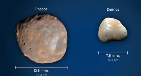 The Martian Moons eXploration spacecraft is planning to study both moons and collect rock samples from Phobos. Phobos’s orbit takes it closer to Mars than Deimos, circling the planet at about 6,000 km above the surface. For comparison, the Moon is 385,000 km above the Earth.