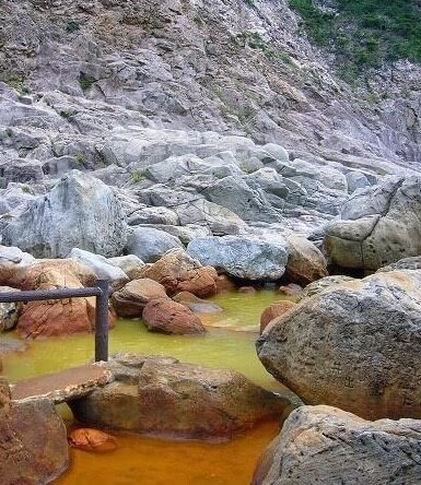 The Izu islands are all volcanic, created by the underwater movements of the Philippine and Pacific tectonic plates. That boundary remains in flux, and thus the hot springs and volcanoes. The terrain can be pretty rugged: in English, Jinata translates to something like Earth Hatchet, since the hot spring is at the end of a path through what does look like a rock rising that had been cut through with a hatchet.