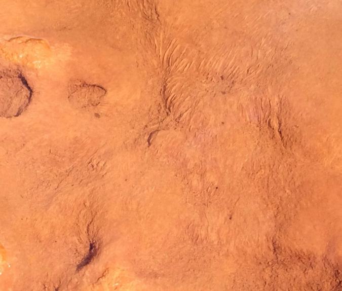 Nearby the steaming bubbling of the hot spring were collections of what appeared to be fine etchings on the bottom of the red channel. These faint designs, McGlynn explained, were the product of a microbe that makes it’s way along the bottom and deposits lines of processed iron oxide as it goes. So while the elegant designs are not organic, the creatures that creates them surely is.