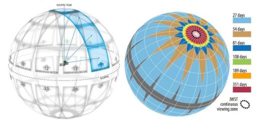 Such a wide sweep means TESS cannot spend long staring at any one position. TESS will observe most of the sky for about 27 days, which is ample for detecting planets on ten day orbits, the most common orbital period found by Kepler. Over the ecliptic pole (90 degrees from the Sun’s position), TESS will observe somewhere between 27 and 351 days. This region is where the JWST will be able to study planets throughout the year.