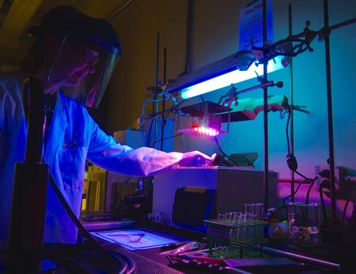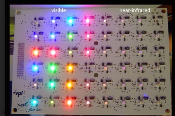 The ultraviolet bulbs include the powerful, germicidal ultraviolet-C variety, some of the glass for the experiment is made of special quartz that is transparent to that ultraviolet light, the LED array has 48 tiny bulbs that can be controlled by software to provide different amounts and kinds of light as identified and provided by Arney