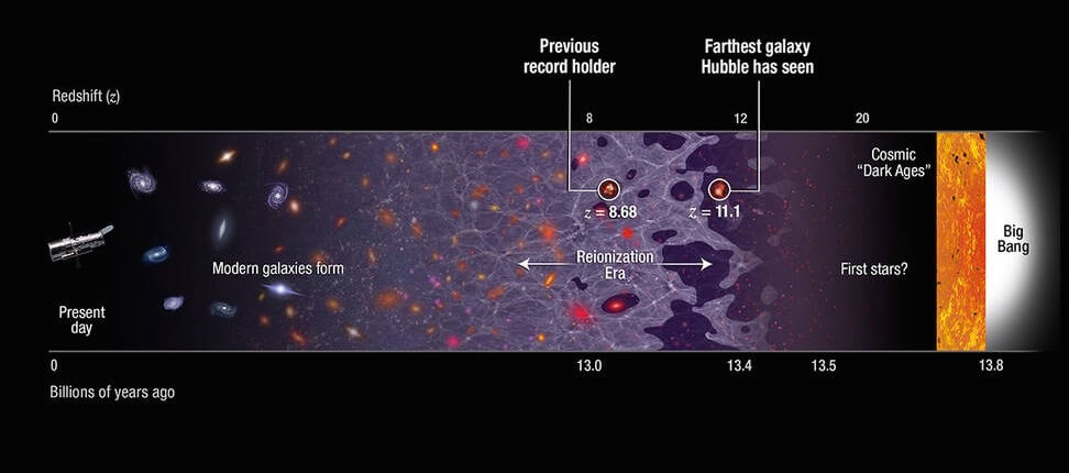 But this image is one of the most comprehensive yet of the history of the evolution of the universe, presenting galaxy light coming to us over a timeline up to those 11 billion years. The image was released last week by NASA and supports an earlier paper in The Astrophysical Journal by Pascal Oesch of Geneva University and a large team of others.