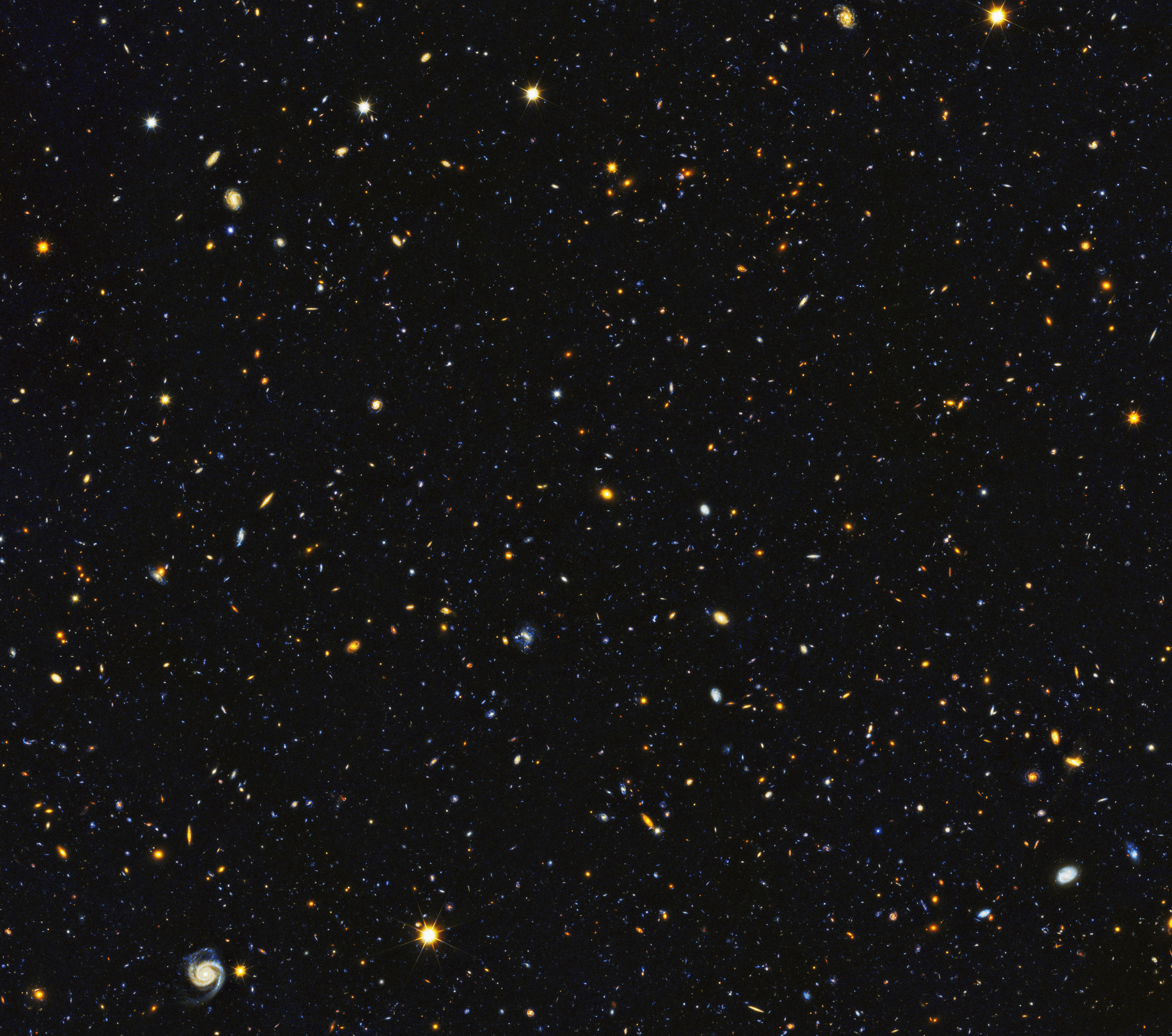 For those unsettled by the first image, here is the 2014 Ultra Deep Field image, which is 1/14 times the area of the newest image. More of the shapes in this photo look to our eyes like they could be galaxies, but those in the first image are essentially the same.
