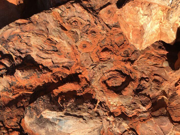 The side views of the stromatolite-laden rock revealed the expected conical layered shapes we saw in younger rocks (and in the living stromatolites of Shark Bay). Everything we had learned about stromatolite structures was clearly visible in this circa 3.43 billion year old example. It is astounding to realize that complex phototrophic (light-eating) organisms, even if not yet oxygen producing, were around during the deposition of the Strelley Pool Formation.