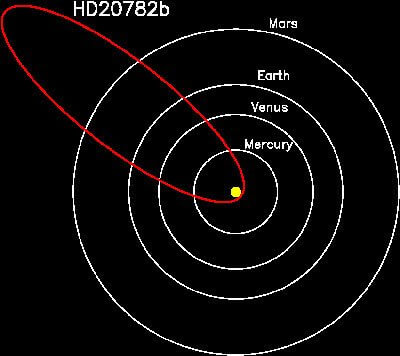 The most extreme eccentric orbit found so far is HD 20782, measured at an eccentricity of .96. This means that the planet moves in a nearly flattened ellipse, traveling a long path far from its star and then making a fast and furious slingshot around the star at its closest approach.