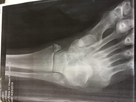 The broken part of my wife’s ankle is the traingle of bone floating near the tibia, to which it should be attached.