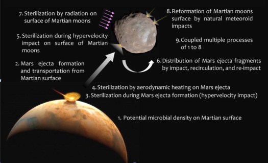 The JAXA team concluded that, while the spread of Mars materials to the moons could and probably would be substantial, 70 to 80 percent of the possible microbes were likely to be dispersed all over the moons’ surfaces and then rapidly sterilized by solar and galactic radiation.