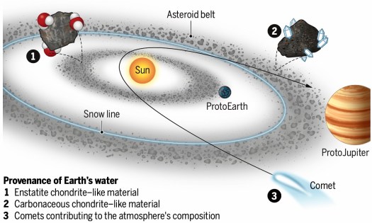 “A water-rich type of chondrite called carbonaceous chondrite was suggested to have brought most of the planet’s water. Carbonaceous chondrites, however, are not ideal because they have a very different isotopic composition than Earth and formed outside of the snow line ”