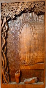 And although he was known as a kind of sober-sides, low-key figure, he also had a dry, “wicked” (but not in a mean way) sense of humor. This sometimes came out in his life-long wood carving, which included a wooden arm (armpit and all) that reached out from a wall near the fireplace and had a working light in it. And then there was his wine cask bas-relief with the feet beneath it.