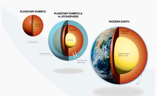 Their conclusion was that atmospheric hydrogen could and would have interacted with other gases in the hot ocean of magma that was then on the planet’s surface (and is hypothesized to exist on all newborn rocky planets before solid crusts can be formed.)